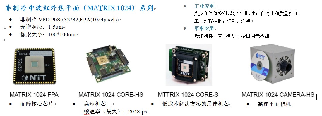 NIT 焦平面展示了非常优秀的性能,实现了市场上非制冷传感器最快的探测速率:MATRIX 1024、CAMERA 能够达到超过1600 画面每秒。NIT 完成整个产品的生产链,自主研发,自主生产单元素探测器,线性阵列和成像焦平面。NIT 也能够交付客户定制的探测器和相机来充实NIT 的标准产品,进而来满足客户的需求,增加产品被要求的功能。